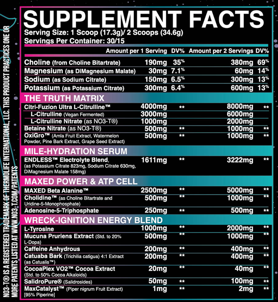 · 8g Citrulline w/ 2g Citrulline Nitrate (NO3-T®) → fuels endogenous arginine → NO synthase AND nitrate → nitrite → NO conversion.