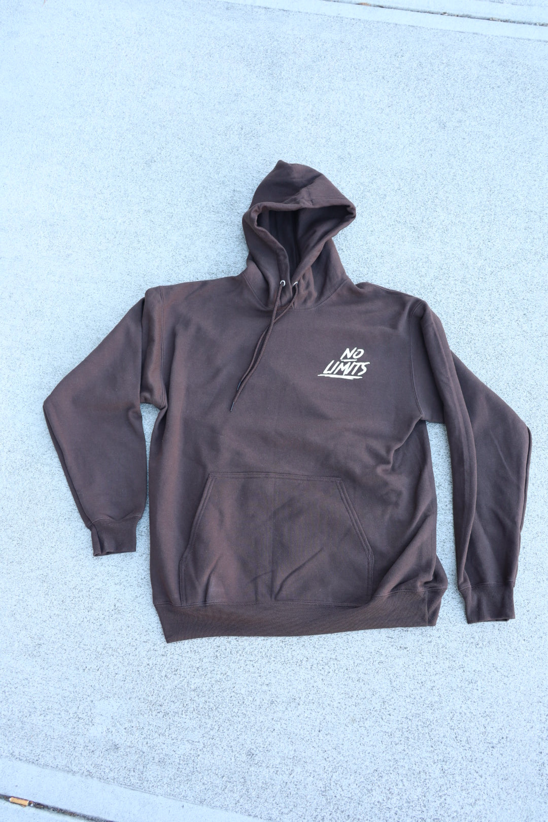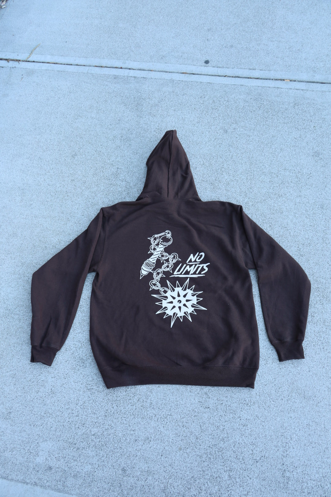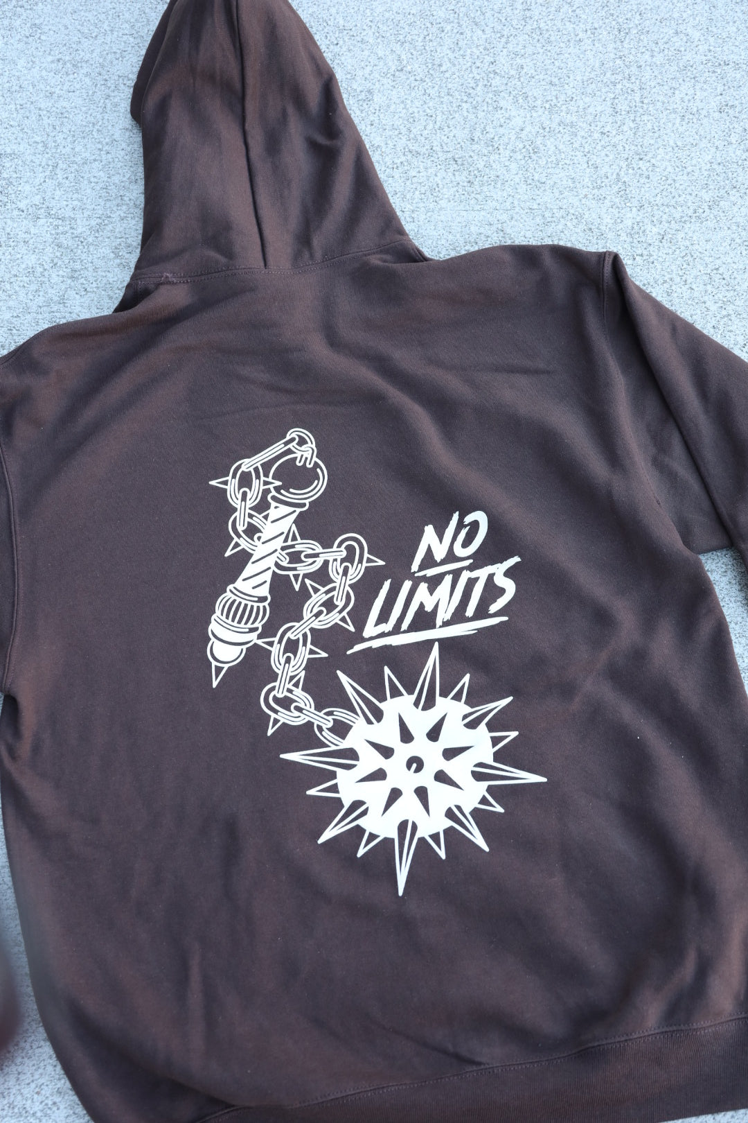 Our Mace design printed on a brown Port & Company hoodie that features a front left chest design in cream, and a back design in cream.