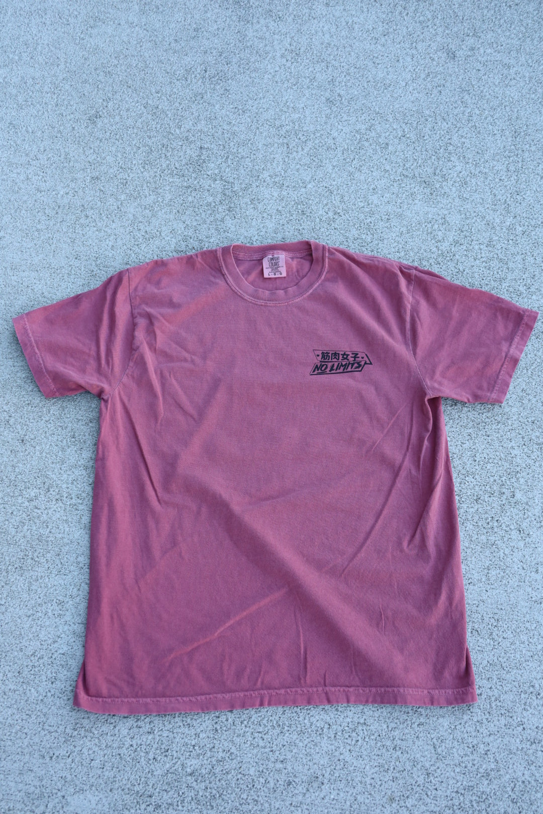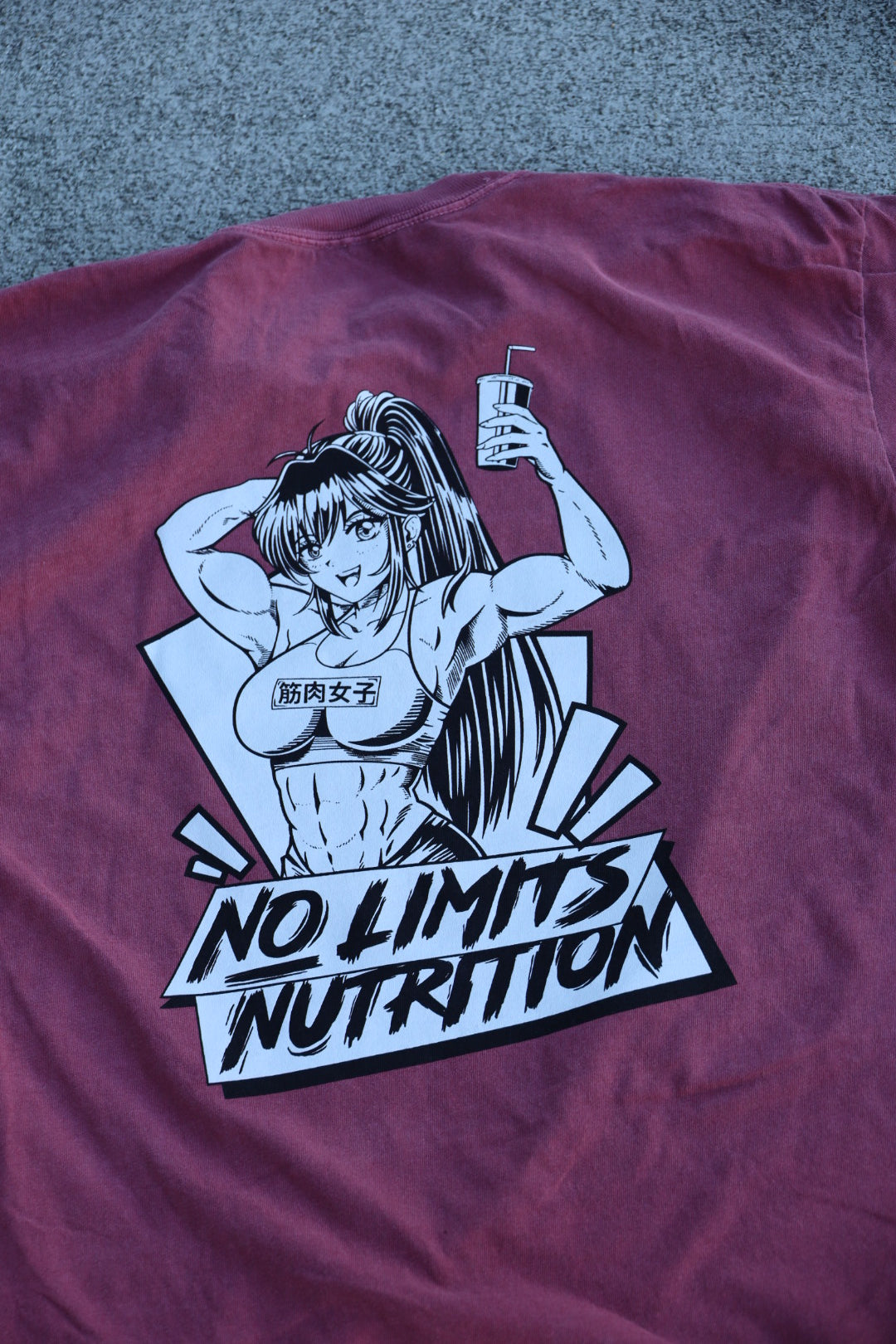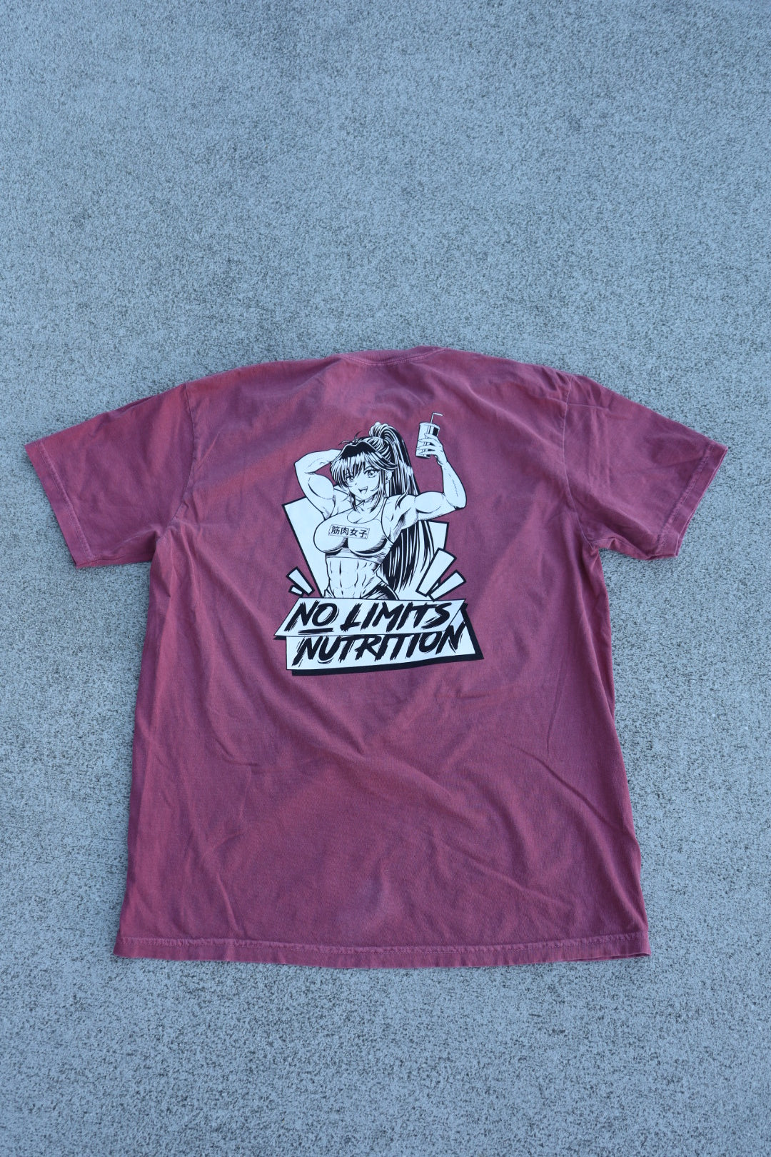 Our classic Anime muscle mommy design printed on a brick colored comfort colors shirt. The shirt features a small black design on the front left chest, and a full black and white design on the back.